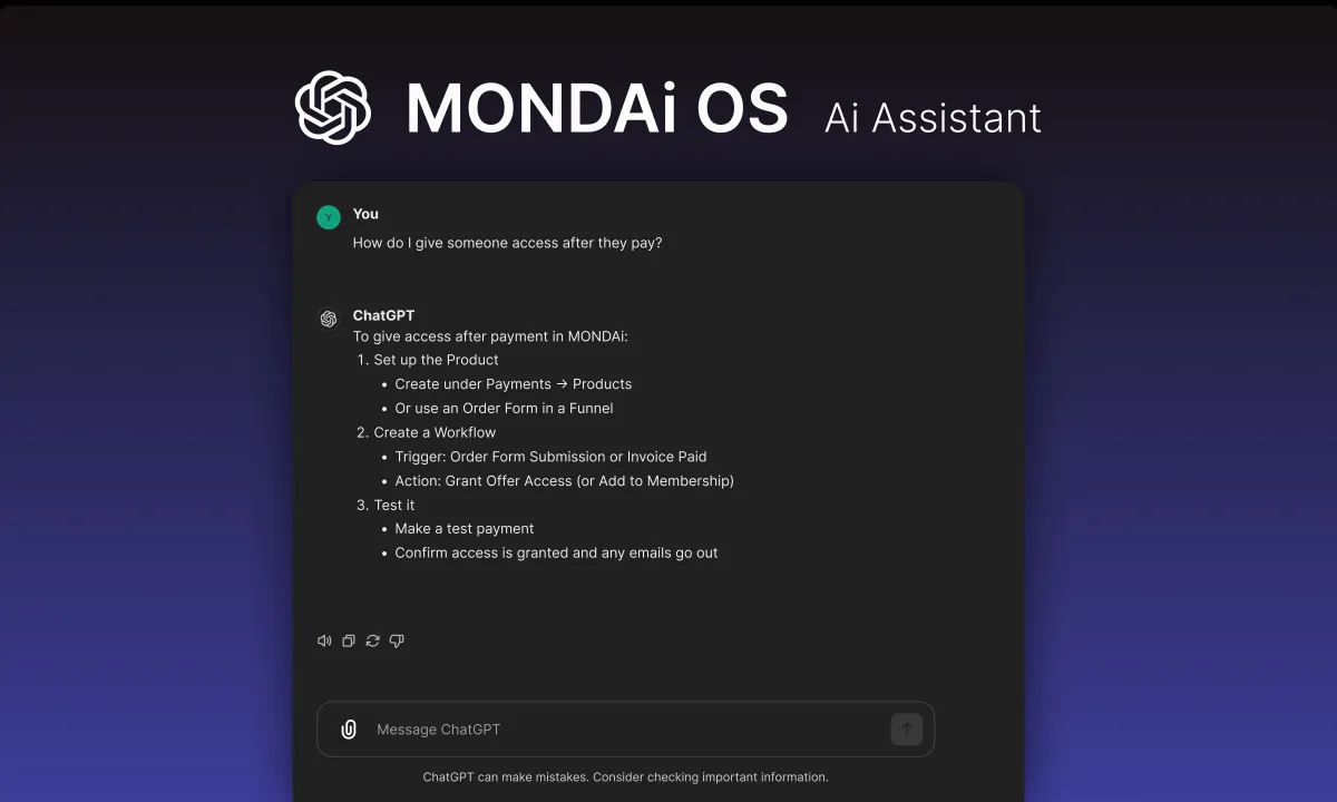 With MONDAi OS, support isn't something you wait for — it's built in. You have 24/7 access to AI-guided assistance for platform setup, troubleshooting, and day-to-day use, covering everything from automations and payments to workflows and integrations.